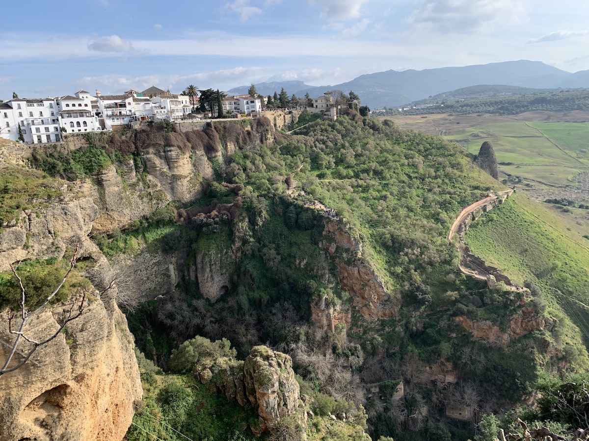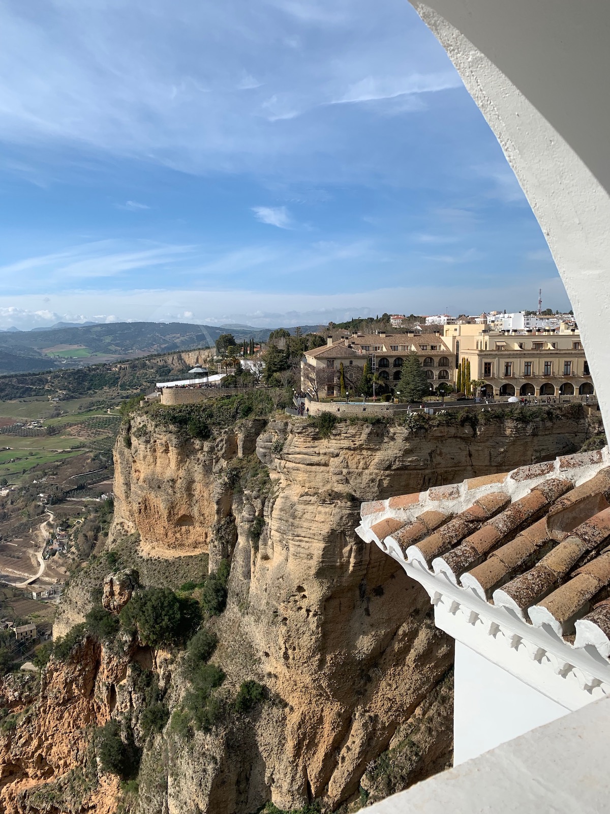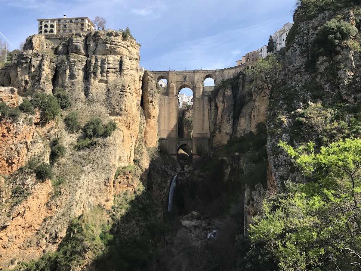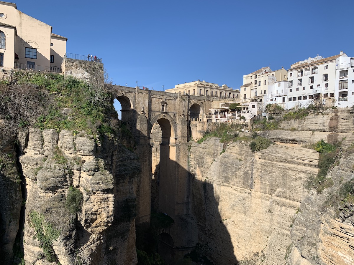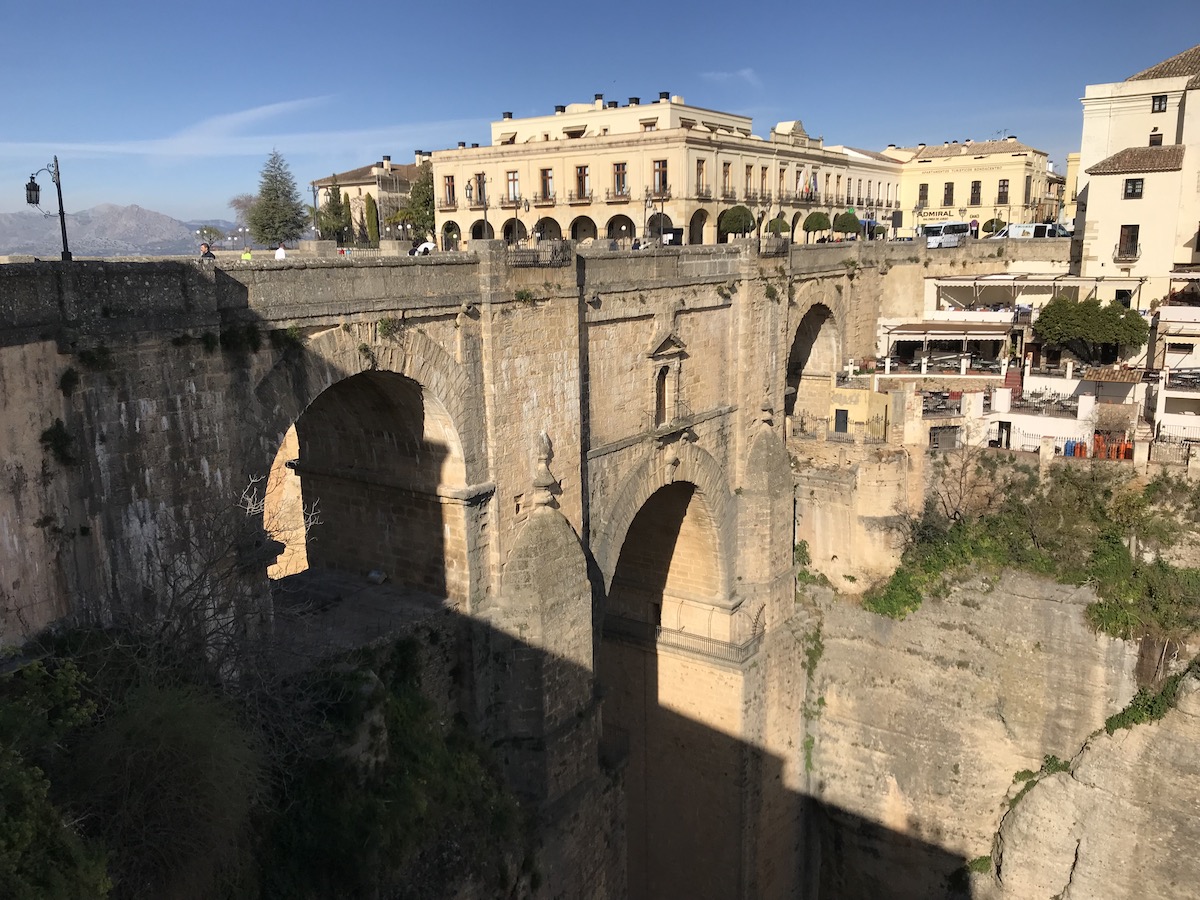 One of the places we were most looking forward to visiting in Spain was Ronda, so we were excited to enjoy a weekend getaway there. It is a relatively small town, located in the mountains northwest of Málaga on the Guadalevin River. The river creates the feature that defines Ronda: El Tajo Canyon, a steep gorge which is over 300 feet deep and divides the town in two. There are three beautiful bridges over the gorge, the Puente Romano (built by the Romans), the Puente Viejo (the “Old Bridge”, built by the Moors), and the mind-blowing Puente Nueve (The “New Bridge”, which despite the name is well over 200 years old). On one side of the canyon is the old, Moorish town, with the whitewashed buildings and narrow, winding streets. The other side contains the new town, with charming plazas and Spain’s oldest bull-fighting ring, along with the more modern outskirts.