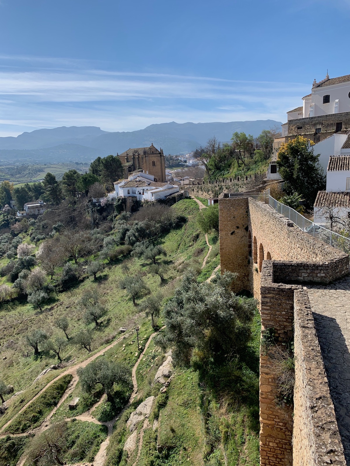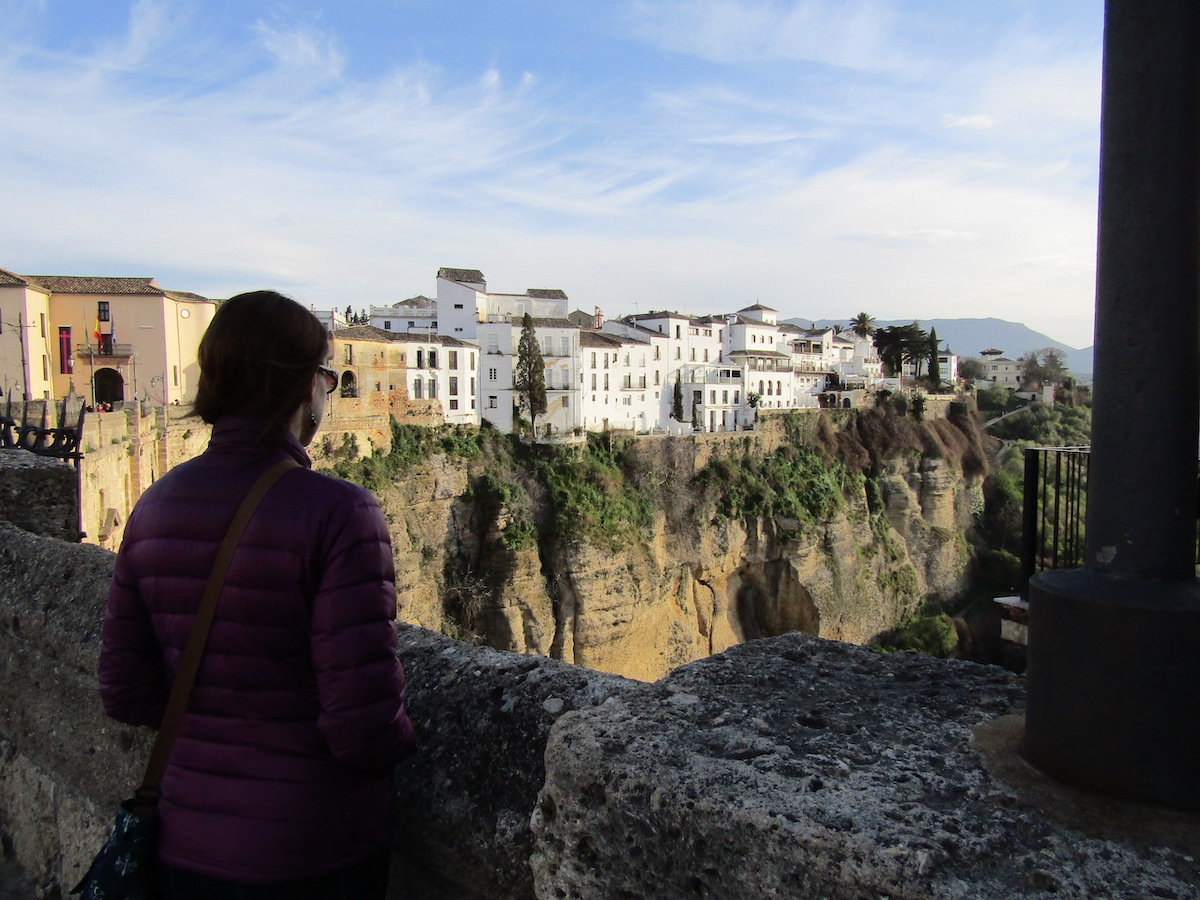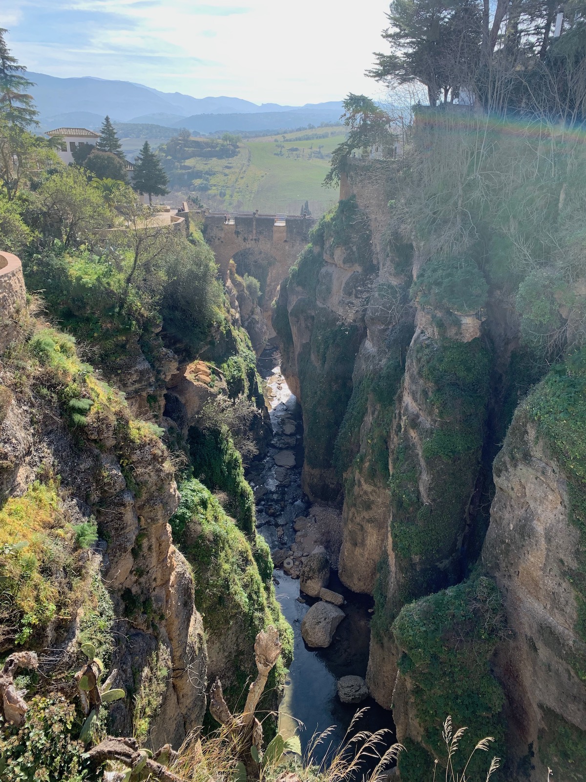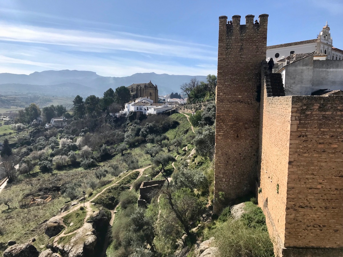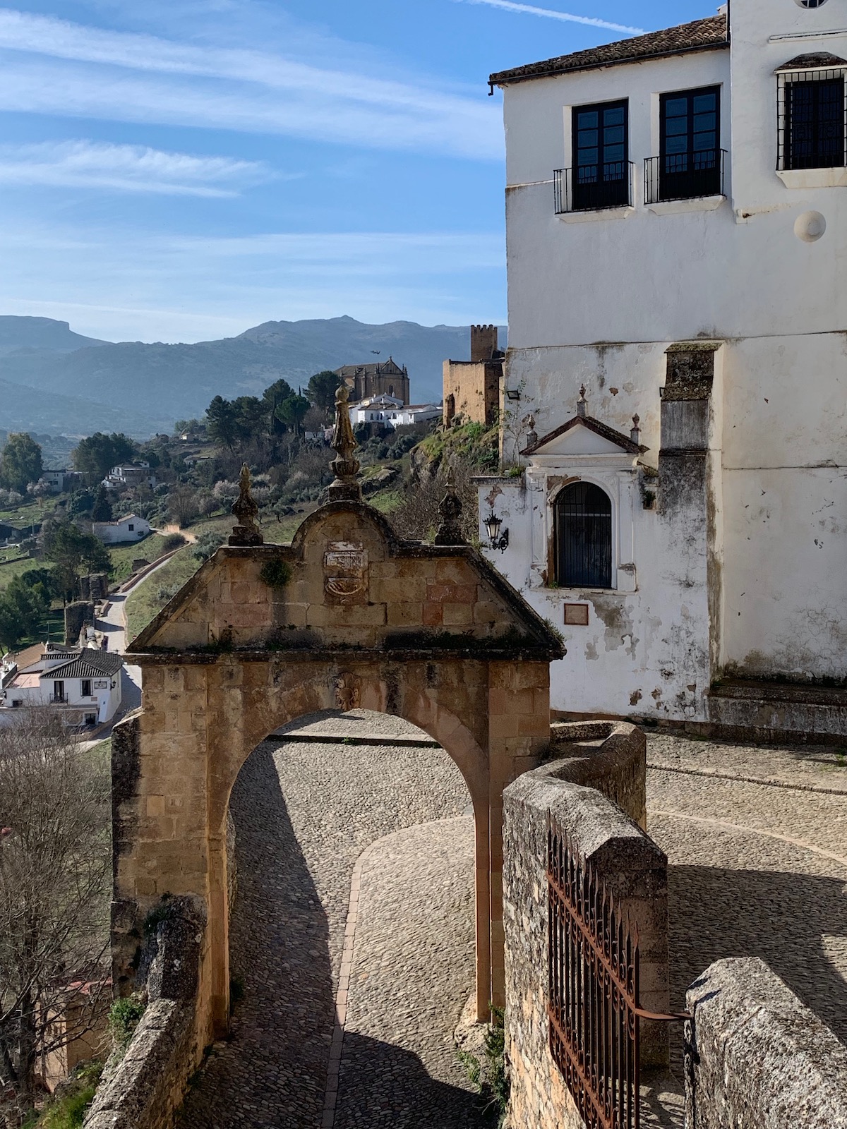 One of the places we were most looking forward to visiting in Spain was Ronda, so we were excited to enjoy a weekend getaway there. It is a relatively small town, located in the mountains northwest of Málaga on the Guadalevin River. The river creates the feature that defines Ronda: El Tajo Canyon, a steep gorge which is over 300 feet deep and divides the town in two. There are three beautiful bridges over the gorge, the Puente Romano (built by the Romans), the Puente Viejo (the “Old Bridge”, built by the Moors), and the mind-blowing Puente Nueve (The “New Bridge”, which despite the name is well over 200 years old). On one side of the canyon is the old, Moorish town, with the whitewashed buildings and narrow, winding streets. The other side contains the new town, with charming plazas and Spain’s oldest bull-fighting ring, along with the more modern outskirts.