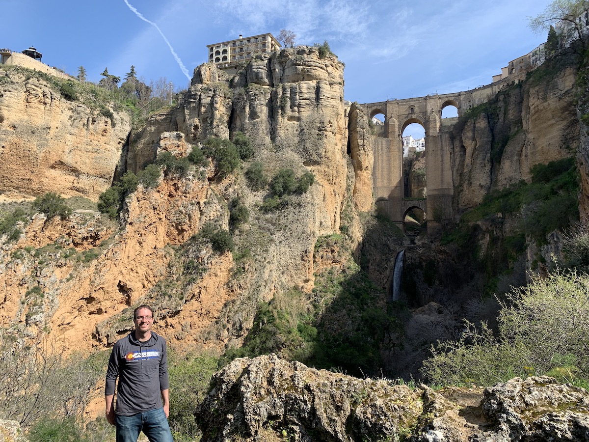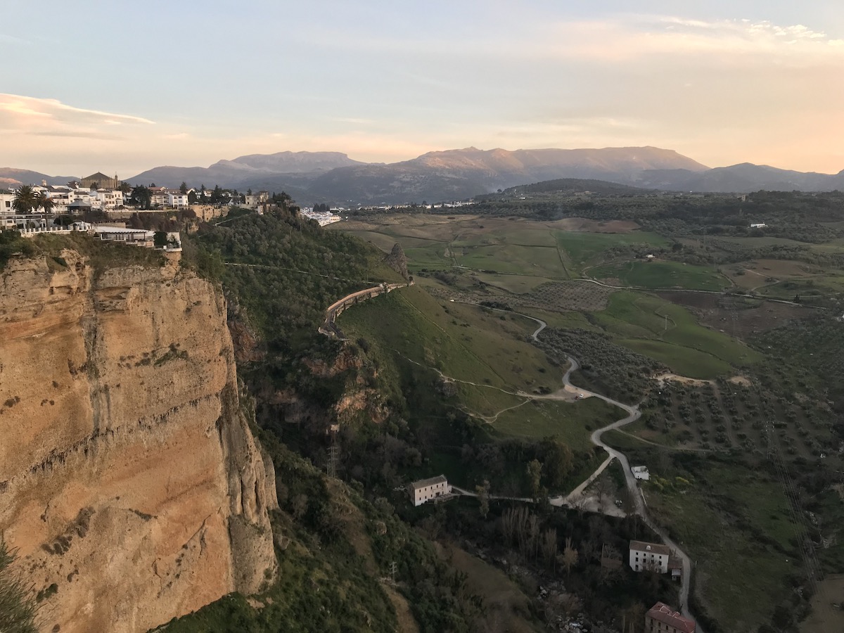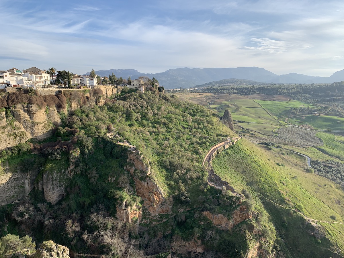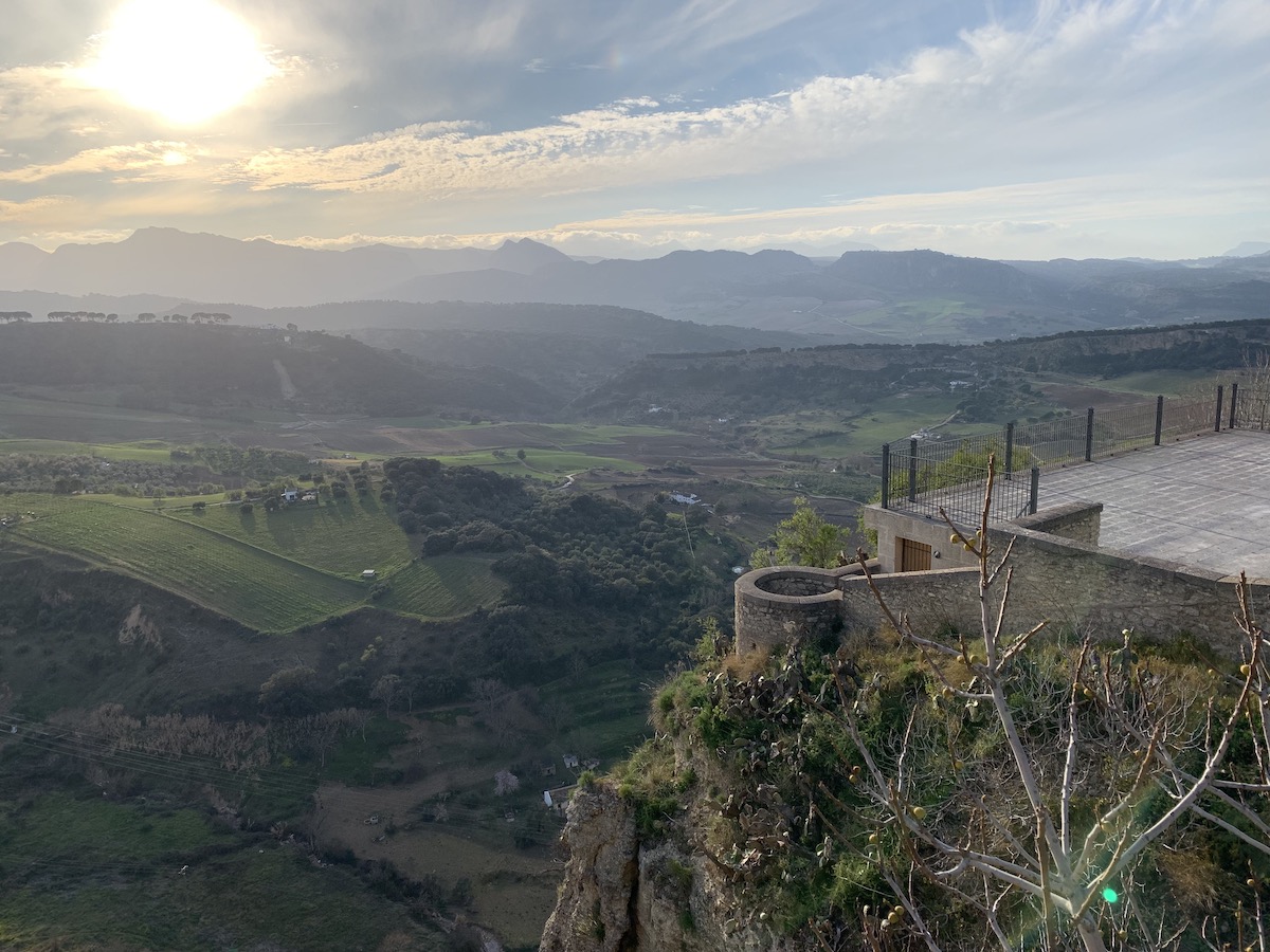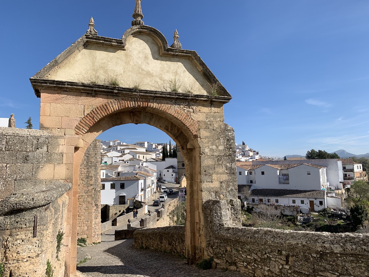 One of the places we were most looking forward to visiting in Spain was Ronda, so we were excited to enjoy a weekend getaway there. It is a relatively small town, located in the mountains northwest of Málaga on the Guadalevin River. The river creates the feature that defines Ronda: El Tajo Canyon, a steep gorge which is over 300 feet deep and divides the town in two. There are three beautiful bridges over the gorge, the Puente Romano (built by the Romans), the Puente Viejo (the “Old Bridge”, built by the Moors), and the mind-blowing Puente Nueve (The “New Bridge”, which despite the name is well over 200 years old). On one side of the canyon is the old, Moorish town, with the whitewashed buildings and narrow, winding streets. The other side contains the new town, with charming plazas and Spain’s oldest bull-fighting ring, along with the more modern outskirts.